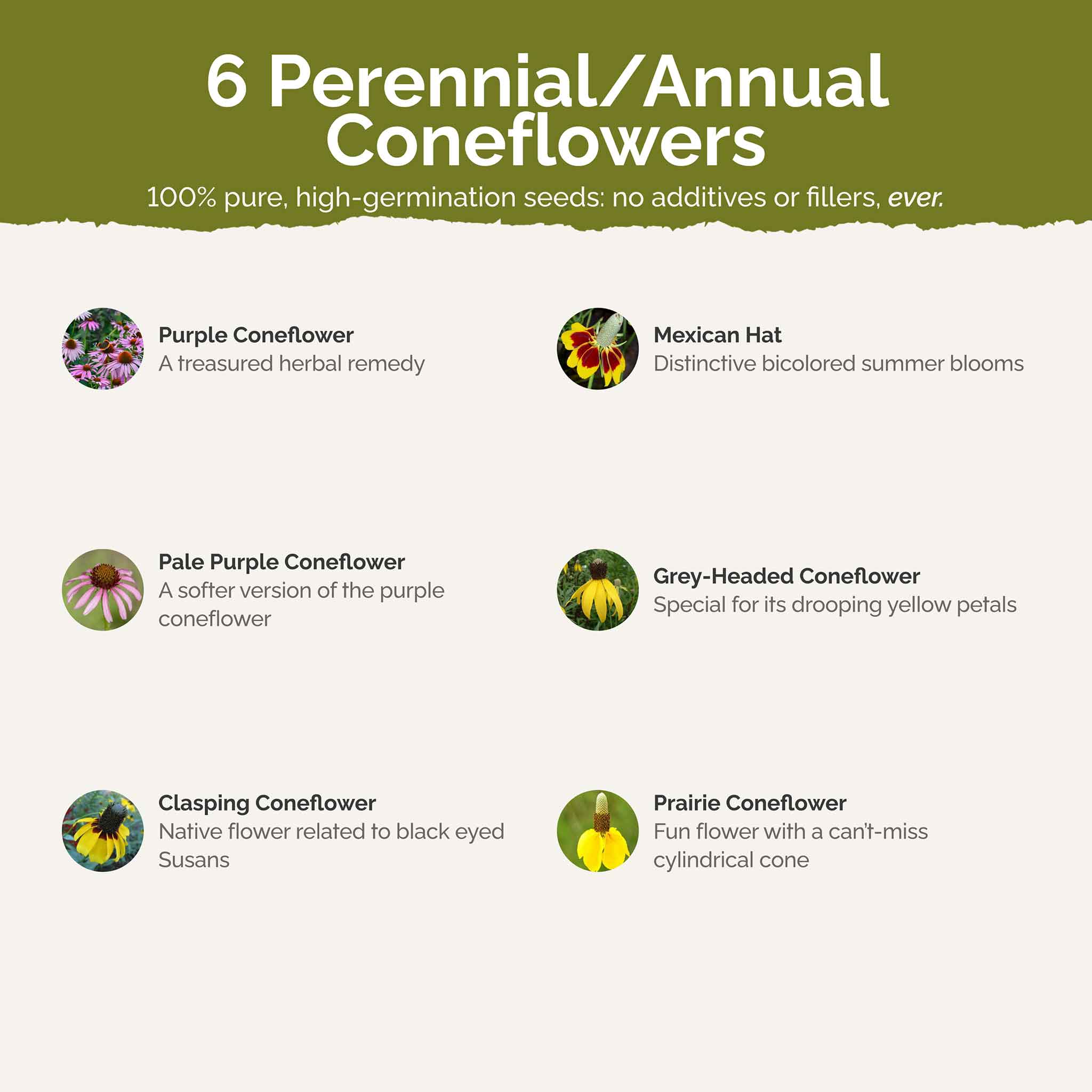 OK, so it's not the most original name for a coneflower mixture, but you must admit that the mix itself is plenty original. In fact, as far as we can gather it's the only one of its kind! This assortment brings the Echinacea and Ratibida families together for the first time in one intriguing mix. Suitable for all regions of North America.